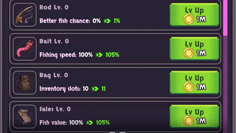 Upgrade your rod, bait, bag - fish you catch can be sold for Gold, Skill Points, or even rare Pearls!
